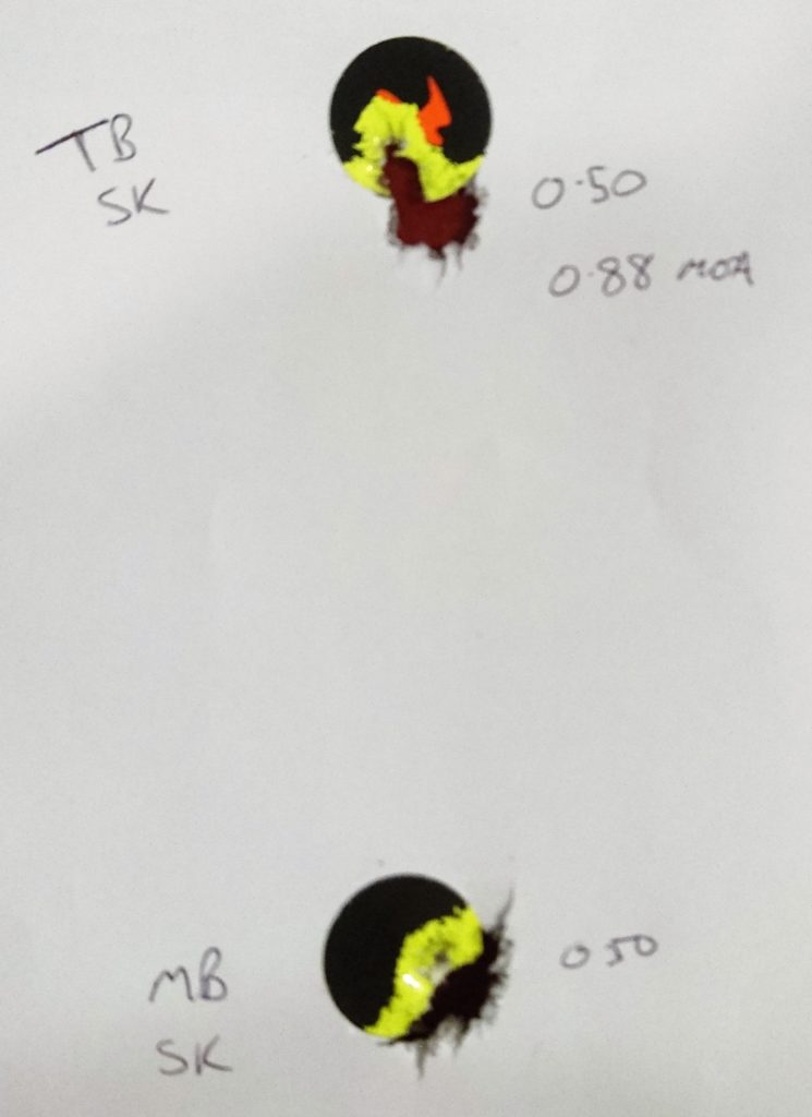 To minimise variables associated with the shooter, we did a couple of things. After Brooky finished shooting, Bourney shot a few groups too, to ensure they were comparable; they were almost identical. Brooky also re-shot his first groups to check whether there was any bias towards accuracy in his later groups after having spent 100+ rounds getting to know the rifle…. turns out there was, with a much tighter SK Standard group through the removal of two flyers, this is represented in the group size data table by an ‘*’, as the measurement is from the re-shoot, rather than the group shown in the photo (note the two fliers in the pic – two of Brooky’s first shots with the rifle). To verify the reshoot was valid, Bourney’s shot a group in that configuration which measured exactly the same as Brooky’s reshoot, so we’re confident it’s a sound representation.